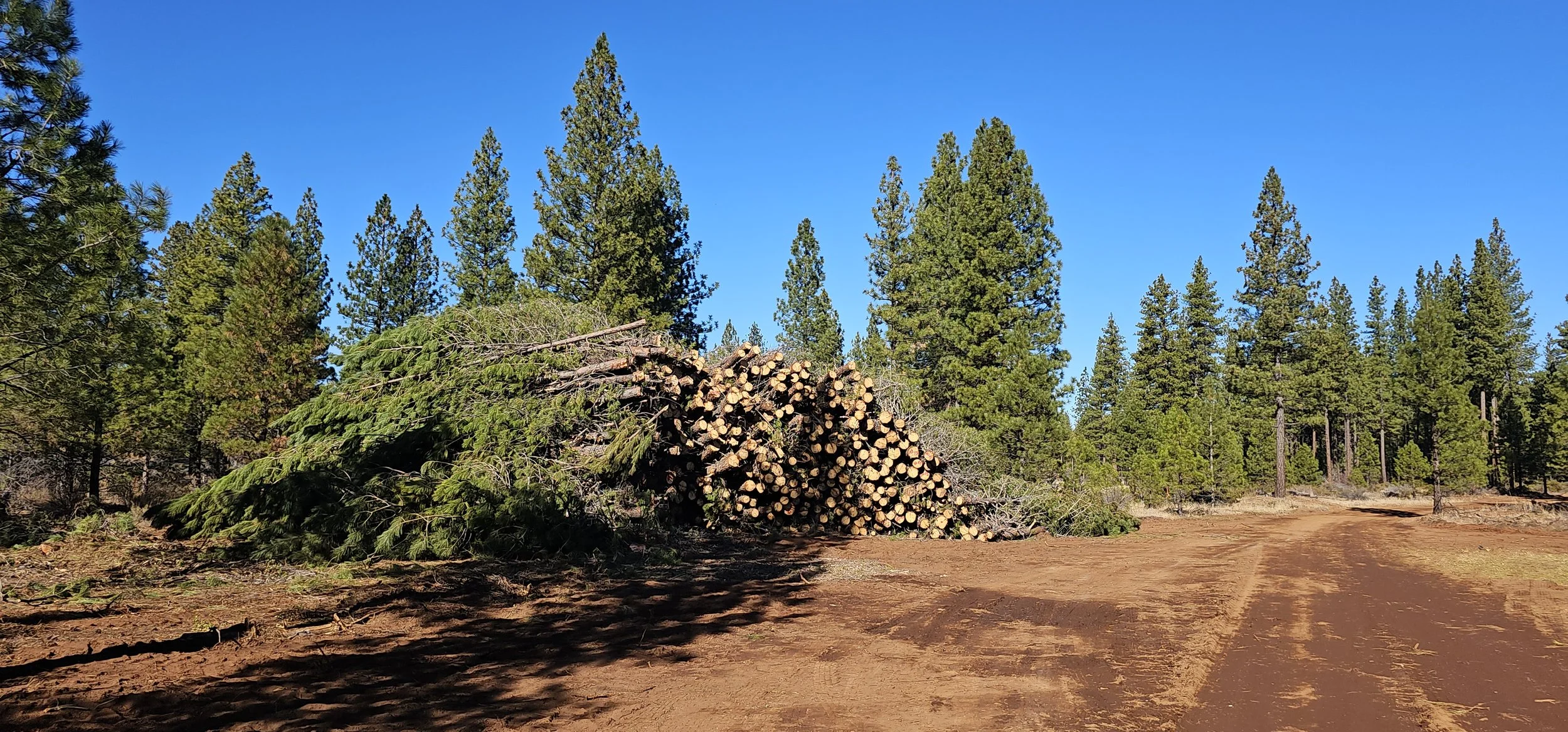 Thinning operations in the plantation aim for wider tree spacing to reduce ladder fuels and fire intensity. In the naturally regenerated areas, mastication is used to break up brush and create irregular openings in the forest, helping to disrupt fire pathways. Trees removed from biomass treatments are chipped and sent to bioenergy facilities, supporting renewable energy use and reducing project emissions.